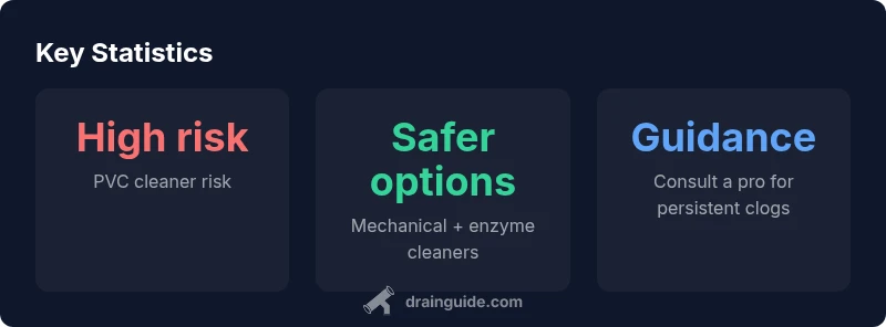 PVC is chemically resistant to many solvents, but heavy-duty drain cleaners—especially caustic or oxidizing formulas—can soften or weaken plastic over time. Repeated exposure can also affect glue joints or compression fittings that hold sections together. For a typical home system built with PVC, using Drano can lead to brittle seams or degraded gaskets, particularly if the pipe has a rough interior or a tight bend. The practical takeaway is that even if a clog seems solvable with a chemical, the risk to the pipe network could outweigh the benefit. Drain Guide highlights that the safest path is to avoid prolonged chemical contact and to consider alternate strategies first, particularly when the plumbing involves PVC. If a cleaner is unavoidable, read the label carefully and limit contact time, but remember PVC joints are generally better preserved by safer methods.
