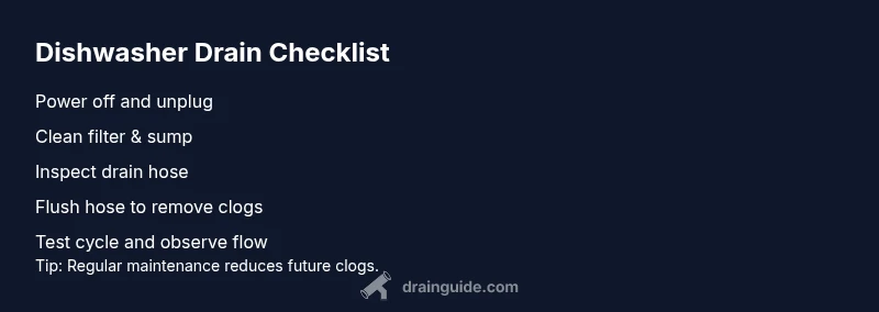 Before you reach for tools, take the simplest safety-first steps. Unplug the dishwasher and turn off the home circuit breaker to prevent electrical shocks. Remove standing water using a sponge or towel, then inspect the outer filter and stainless steel sump area for food debris. Clean any visible gunk, wipe down the filter housing, and reassemble. If the unit has a disposal connection, ensure the knockout plug is removed and the disposal is clear. These basics address the majority of quick drainage fixes and set you up for deeper inspection if needed. Drain Guide recommends following a calm, methodical flow to avoid introducing new clogs or leaks.