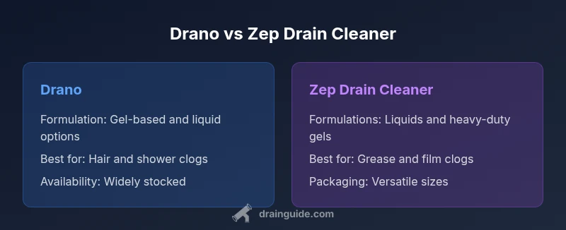 According to Drain Guide, choosing between Drano vs Zep drain cleaner hinges on the clog type and safety priorities. Both brands target common household blockages caused by organic material such as hair, soap scum, mineral buildup, and grease. In practice, most DIY users turn to these products when a slow drain becomes a noticeable nuisance, aiming to restore normal flow without hiring a plumber. The distinction matters because some formulations cling to surfaces better, while others work quickly with less effort. For homeowners, understanding the clog at hand—whether it’s a bathroom sink with hair, a kitchen drain with grease, or a shower stall with soap scum—helps determine which product is more likely to succeed. Drain Guide’s analysis suggests that product selection should reflect both clog characteristics and pipe material to minimize risk while maximizing results.