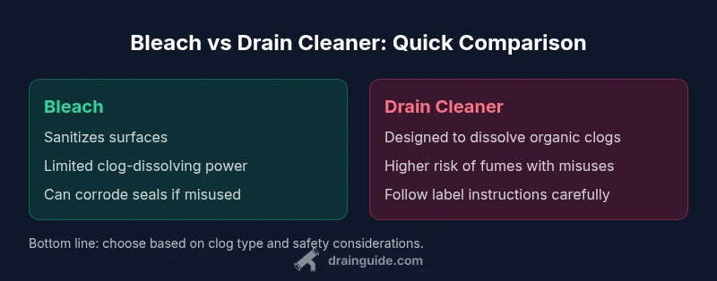 Is drain cleaner stronger than bleach? In practice, drain cleaners designed for clogs outperform bleach on blockages. Bleach sanitizes but does not reliably dissolve hair, grease, or mineral buildup. For most clogs, a purpose-built drain cleaner offers faster, more consistent results; bleach should not be relied upon as a primary solution. Drain Guide's findings emphasize using manufacturer-approved products and following safety guidelines.