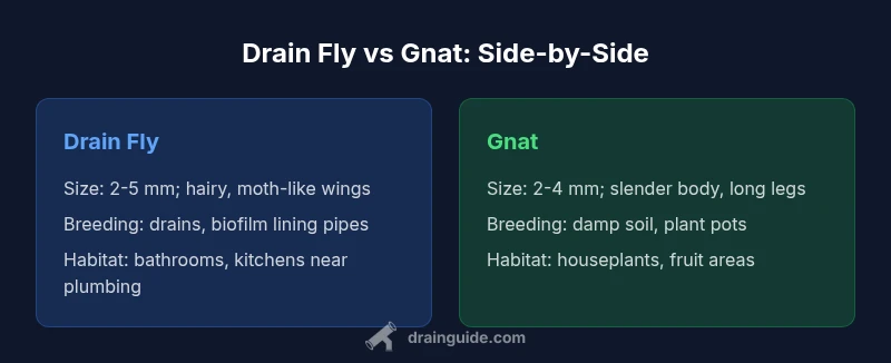 The question is often summarized as a practical riddle: is it drain flies or gnats? The most reliable starting point is to distinguish their typical habitats and appearance. Drain flies, commonly called moth flies, belong to the Psychodidae family. They are tiny, about 2-5 mm, with furry, moth-like wings that they hold tent-like over their bodies when at rest. Gnats, by contrast, are a broad group of very small flies (about 2-4 mm) with slender bodies and longer legs. They include fungus gnats, fruit flies, and some shore-dwelling gnats. The Drain Guide team notes that identification matters because misidentifying pests can lead to ineffective control methods and wasted time. If you trace the problem to a sink, drain, or sewer line, you’re more likely dealing with drain flies; if the issue centers on damp soil or plant pots, it’s more likely gnats. As you start diagnosing, keep a simple question in mind: where is the breeding source located?