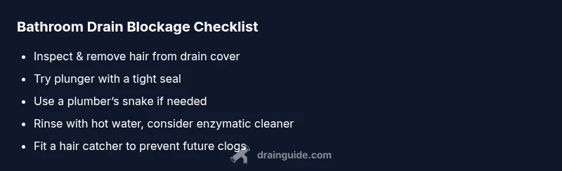 A blocked drain in bathroom is a common issue that interrupts daily routines. You might notice slow drainage, gurgling sounds, or water backing up into the sink, tub, or shower. Hair, soap scum, and mineral deposits often build up at the trap or in the drain pipe, creating a tight obstruction over time. The problem tends to start small and worsen with each use, so addressing it promptly can prevent a bigger backup. According to Drain Guide, homeowners who act early typically recover faster and with fewer tools. In many cases, the culprit is a localized hair and soap scum build-up, not a broken pipe. Quick, calm action reduces mess and prevents overflows, especially during busy mornings or after showering with hot water.