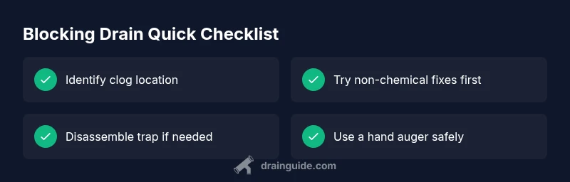 A blocking drain is usually caused by hair, grease, soap scum, or debris lodged in the trap or pipe. Start with simple fixes: plunge the drain, try a plumber’s snake, and avoid harsh chemical cleaners. According to Drain Guide, safety comes first—shut off water, wear gloves, and proceed methodically; call a pro for persistent clogs.