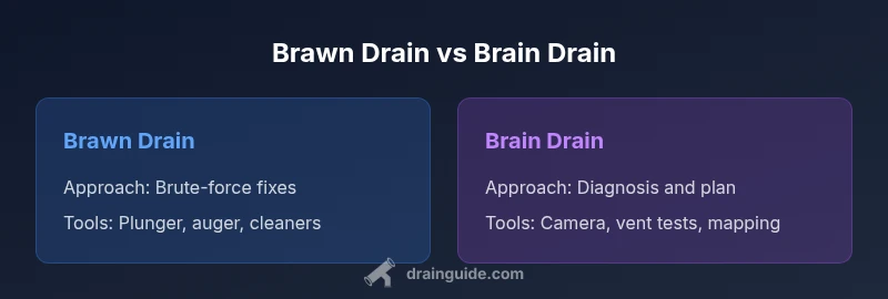 In household drainage work, the phrase "brawn drain vs brain drain" captures two contrasting mindsets. A brawn drain approach relies on hands-on, brute-force tactics: plungers, manual snakes, forceful flushes, and the heavy use of chemical cleaners to push a clog loose. A brain drain approach prioritizes diagnosis, planning, and systemic thinking: mapping the drainage layout, identifying venting or trap issues, and testing hypotheses about the root cause before acting. The distinction matters because the wrong approach can waste time, damage pipes, or simply move a clog from one location to another. According to Drain Guide, homeowners who begin with a quick diagnostic check and then apply targeted fixes tend to see fewer repeat clogs and less risk of overexerting pipes. The goal isn't to pick one tactic over the other forever but to know when to switch gears and how to sequence actions for the best long‑term outcome.