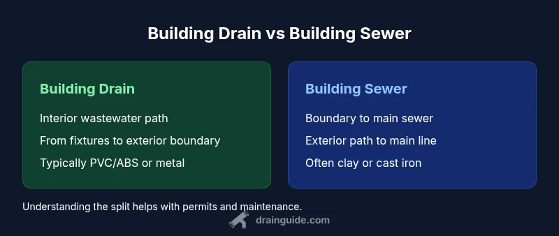 According to Drain Guide, the term building drain describes the wastewater piping inside and immediately under the footprints of a building that carries used water from sinks, toilets, and appliances toward the exterior. In many codes and common English usage, people interchange building drain with building sewer, but the precise definition matters for planning, inspections, and repairs. The building drain is typically the portion of pipe that starts at the interior fixtures and ends at the threshold where the municipal or private sewer line begins outside the building. This distinction is not merely semantic: it affects who is responsible for maintenance, who can access the pipe, and what codes apply during installation or replacement. Drain Guide's analysis shows that homeowners often mix up these terms, especially during remodels or when calling a plumber. In short, the building drain is the inside portion of the wastewater path, while the building sewer extends from the building boundary to the main sewer line. For most homeowners, understanding this difference helps with permits, inspections, and budgeting.