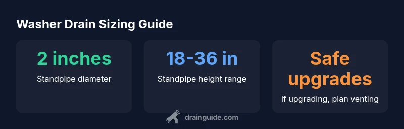 When homeowners start troubleshooting a washer drain question, the first step is to understand what sizing means in this context. Drain sizing affects how quickly water leaves the appliance and how the drainage system handles surges during a wash cycle. At Drain Guide, we emphasize using components that match local code and the manufacturer’s specifications. The typical standpipe and drain connection are designed to prevent overflow, ensure proper venting, and minimize backflow risk. For many homes, a 2-inch standpipe provides a robust margin for peak flow, while undersized options can reduce performance and trigger backups during high-water events. In practice, you may encounter older homes with smaller pipes or nonstandard fittings; in those cases, plan a careful upgrade that preserves venting and trap integrity. Can a reviewer safely size for a washer drain without measuring the existing pipe? Not reliably. Always verify measurements before ordering parts. Drain Guide’s guidance here is to start with a plan that aligns with code and the appliance’s drain hose specifications to reduce call-backs and costly rewrites later.