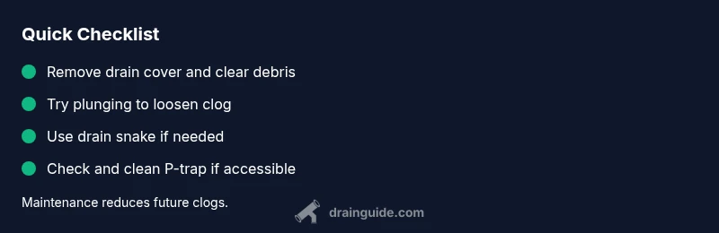 Start by removing the shower drain cover and pulling out hair and debris. Rinse the opening with hot water, then try a plunger to loosen the clog. If that fails, use a drain snake or auger gently to the trap. Flush again, and check the P-trap if accessible. Avoid harsh chemical cleaners and call a plumber if it remains stubborn.