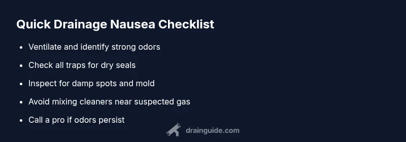 According to Drain Guide, does drainage cause nausea? In some cases, yes, when sewer gases, damp conditions, or microbial growth enter living spaces. This awareness matters because nausea is sometimes a sign of dangerous gas exposure or water intrusion that invites mold. This article walks you through quick safety steps, practical checks, and why addressing drainage odors matters for every homeowner. The approach is practical, not alarmist, and aims to get you from symptom awareness to a concrete plan without delay. Remember, if you smell strong sewer gases, if symptoms worsen, or if anyone has breathing difficulty, leave the area and seek urgent help. Drain Guide recommends a calm, methodical process to identify root causes and minimize exposure while you prepare to involve a licensed plumber if needed.