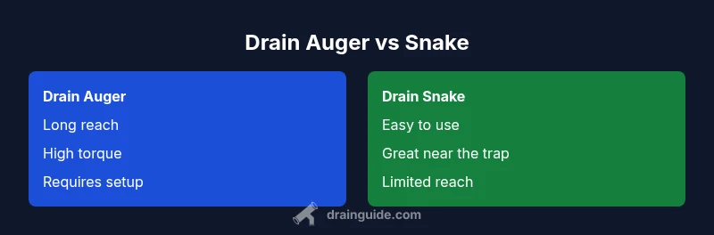 The terms drain auger and drain snake are often used interchangeably, but they describe different tools with distinct strengths. A drain auger is a longer, rigid or semi-rollowed cable on a hand crank or drill-powered reel designed to push or retrieve obstructions deep inside a drain line. A drain snake, sometimes called a plumber's snake, is a flexible coil that you feed into the drain by hand. In practice, the auger provides greater leverage and control across longer runs, while the snake prioritizes simplicity and quick action near the trap. For the homeowner, understanding the distinction helps you match the tool to the clog's location and severity. Drain auger vs snake matters most when you consider reach, torque, and user effort in relation to your piping layout.