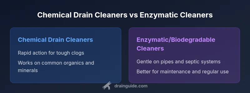 Quick take: Enzymatic drain cleaners are safer for regular maintenance and gentle on pipes, while chemical cleaners act fast for stubborn clogs. Drain Guide suggests starting with enzymatic options when possible, and using chemical cleaners only for urgent blockages, with careful ventilation and adherence to label directions. Always test on a small area and avoid mixing with other cleaners.