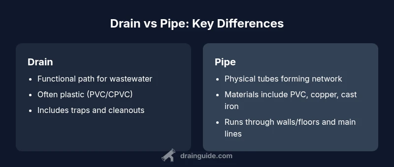 Understanding the difference between drain and pipe is more than vocabulary—it's practical for diagnosis, repair planning, and budgeting. Drain vs pipe describes two parts of the same wastewater system: drains refer to the functional paths that collect and carry used water away from fixtures to a sewer or septic system, while pipes are the actual tubes that form that network. According to Drain Guide, clarifying these terms helps homeowners avoid common missteps when shopping for replacements or planning a project. In most homes, you will encounter both along with traps, vents, and cleanouts. This article explains the distinction in clear terms, then shows how to apply that knowledge to real-world scenarios, from under-sink clogs to mainline leaks, using language that is accessible to DIYers and homeowners.