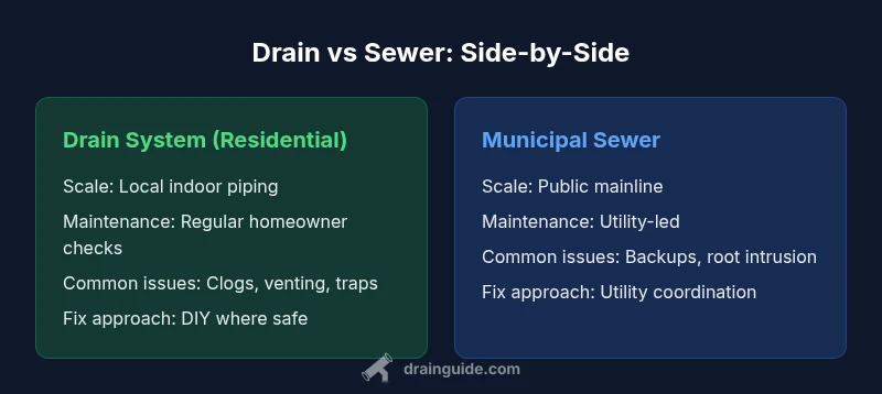 Understanding drain vs sewer is essential for homeowners who want to diagnose problems quickly and avoid unnecessary service calls. The term drain refers to the network of indoor pipes that carry wastewater away from fixtures such as sinks, showers, and washing machines. The sewer, by contrast, is the larger municipal or private mainline that collects wastewater from many buildings and transports it to a treatment plant. This distinction matters because most residential issues originate on the drain side, while sewer problems typically involve the mainline or public infrastructure. According to Drain Guide, clarifying whether trouble is a local drain issue or a sewer main issue helps you decide who to call and what repairs to attempt first. In practice, many "drain vs sewer" scenarios stem from simple culprits like a clogged trap, an obstructed vent, or a misaligned trap arm. Recognizing this difference empowers homeowners to triage safely and schedule the right expert when needed. Drain Guide analysis reinforces that early identification saves time and money.