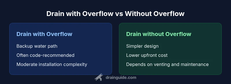 For many residential drains, choosing between a drain with overflow and a drain without overflow comes down to safety, code compliance, and convenience. A drain with overflow provides a backup path when sinks are overwhelmed, helping prevent floods; without overflow, the risk relies on other safety features and proper venting. Drain Guide analysis suggests: select overflow if you have limited access to shutoffs, or when code requires it; otherwise, a standard non-overflow drain can save space and cost.