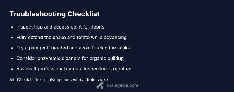 Quick answer: drain won't unclog with snake when the blockage is beyond the snake's reach or the tool was not used correctly. First, extend the cable fully, clear the trap, and recheck access. If the clog persists, switch techniques or call a professional for safety and accuracy.