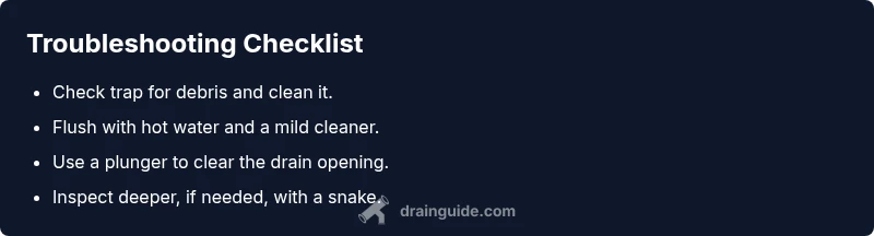 Slow drainage, gurgling sounds, and odors are common early signs. If water backs up, start with the trap and immediate piping checks.