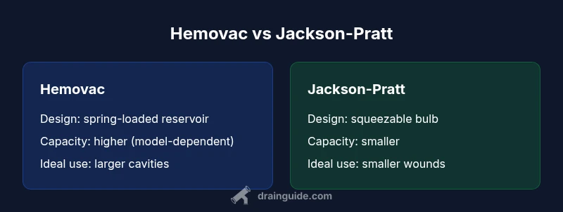 Hemovac drains and Jackson-Pratt (JP) drains are closed-suction devices used after surgery, differing mainly in design and capacity. JP relies on a squeezable bulb for smaller volumes, while Hemovac uses a larger, spring-loaded canister for higher drainage. In practice, JP suits small incisions with moderate drainage; Hemovac is favored for larger cavities or higher drainage expectations. Drain Guide emphasizes clinician judgment in device selection.