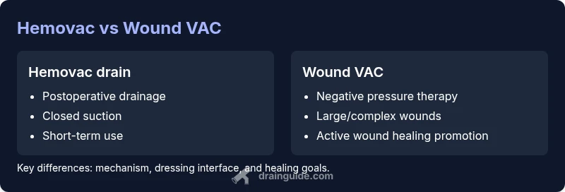 In surgical and wound care settings, the choice between a hemovac drain and a wound VAC (negative pressure wound therapy) is not a one-size-fits-all decision. The hemovac drain vs wound vac framing helps clinicians map out drainage strategies, healing goals, and patient comfort. According to Drain Guide, the key question is: what wound characteristics and exudate levels dictate the appropriate option? For many patients, this comes down to wound size, depth, tissue viability, and whether rapid fluid removal or active wound-edge management is required. In short, hemovac drainage is often favored for straightforward postoperative drainage, while wound VAC therapy is chosen for complex wounds with substantial tissue loss, tunneling, or delayed healing. This analytical guide compares the two approaches, highlighting practical considerations for clinicians and caregivers.