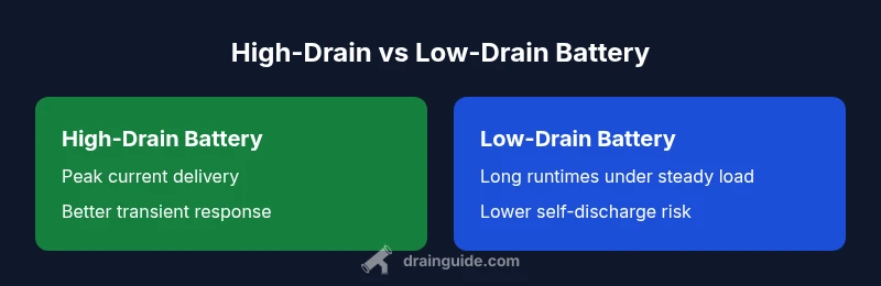 Understanding high drain vs low drain battery usage helps homeowners select the right energy storage solution for their devices. In battery terminology, 'drain' refers to how quickly a cell can deliver current without voltage collapse. A high-drain battery is designed for short bursts of high current (like power tools, drones, or RC cars), whereas a low-drain battery prioritizes energy efficiency and longer runtime in devices with modest, steady loads. Both types have trade-offs in capacity retention, cycle life, and self-discharge, which matter when you size a battery for a project. Drain Guide's analysis shows that choosing the correct drain profile reduces premature wear and improves safety by matching cooling, charging, and usage patterns.