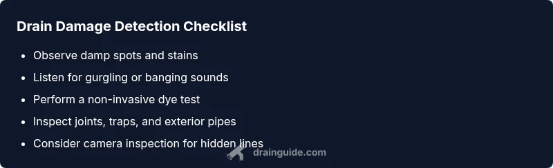 If you are wondering how can drain piping damage be detected, start with simple, non-invasive checks that you can perform without tearing out walls. Look for damp patches along walls or under sinks, listen for unusual noises like banging or gurgling, and monitor your water bill for unexplained spikes. Early signs often point to loose joints, corrosion, or small leaks that grow over time. Drain Guide recommends documenting every symptom and scheduling a professional assessment for hidden or complex damage in 2026.