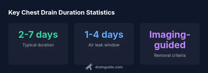 Most chest drains stay in for 2-7 days, but some cases need longer if air leaks persist or the underlying condition takes longer to improve. Removal is based on clinical signs, imaging, and drainage levels.