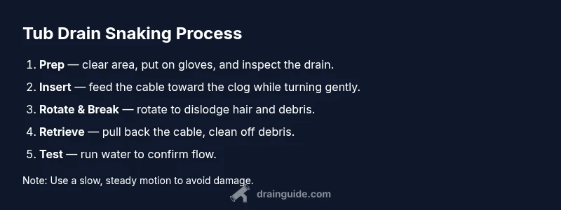 Hair and soap scum are the usual villains behind tub drains that run slow or stop altogether. Water draining slowly is a sign that hair, skin flakes, and mineral deposits have formed a compacted mass inside the trap or along the pipe. In many cases, a relatively shallow clog near the drain can be cleared with a hand auger—also called a drain snake. According to Drain Guide, snaking is a targeted method that preserves the pipe when used correctly and reduces the need for caustic cleaners. The tub’s trap, elbow joints, and nearby cleanout vary by model, so the first step is to inspect the area and identify how you will access the interior of the line. If your tub has a visible cleanout cap or a removable cover, you can skip guesswork and proceed to insert the snake with a clear path. If not, you may need to loosen a trap adapter or remove an access plate. Not every clog requires a snake; for soft, moveable debris, plunger or hot-water flushing may suffice, but for hair clogs or buildup that won’t budge with water alone, a snake offers the best chance of restoring full drainage without displacing seals or liners. Drain Guide’s practical approach emphasizes starting with the simplest method and escalating to mechanical tools only when necessary. In many homes, the first sign of trouble is a slow drain that worsens after shampooing or bathing. Treat this as a cue to check the trap and plan a careful snaking session rather than rushing to harsher methods. The outcome hinges on a calm, measured approach that protects pipes and fixtures.