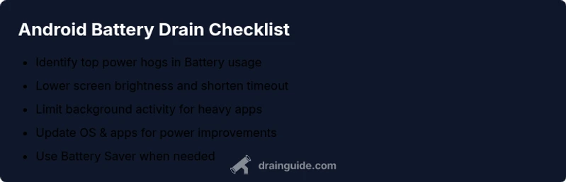Most Android battery drain comes from screen-on time and background wakeups. Start by opening Settings > Battery to see which apps consume power, then disable or restrict high-usage apps and enable Battery Saver when needed. If the cause isn’t obvious, use a structured diagnostic flow to isolate settings, services, and hardware factors.