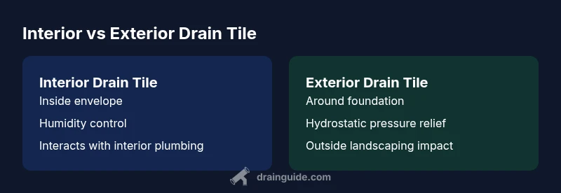 Drain tile is a gravel-packed conduit used to redirect water away from a structure. When you hear about interior vs exterior drain tile, you’re looking at two strategic placements: one inside the building envelope to address indoor moisture, and one outside the envelope to manage groundwater before it can reach the foundation. In practice, the interior approach focuses on controlling humidity and water intrusion within basements or crawl spaces, while the exterior approach targets hydrostatic pressure around the foundation. According to Drain Guide, the choice should hinge on site conditions, climate, and the building’s vulnerability to water. The Drain Guide team found that many homes benefit from a tailored combination, but sound planning is essential to avoid channeling water in unintended directions. For homeowners, the first step is to map the moisture sources—interior leaks, exterior hydrostatic pressure, or both—and then select a tile strategy that fits the landscape and the budget. The keyword interior vs exterior drain tile will recur as you weigh options, because the decision affects waterproofing details, maintenance, and long-term durability.