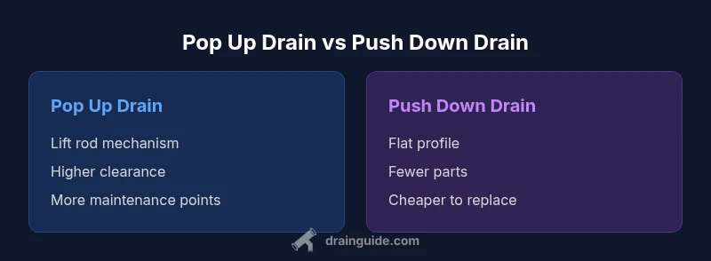 According to Drain Guide, understanding the difference between a pop up drain vs push down drain is essential for homeowners tackling sink clogs and maintenance. Both designs anchor a stopper but use different mechanisms to seal or release water. The choice often hinges on your sink configuration, vanity height, and how you clean the basin. In practice, many households encounter clogs near the stopper, so recognizing which design you have helps guide maintenance steps and replacement planning. This article defines each type, explains their core components, and sets up practical comparisons that you can apply to kitchen and bathroom sinks. While names imply simplicity, the inner hardware—lift arms, pivot rods, springs, and seals—determines how easy it is to clear hair and debris. Understanding this distinction helps homeowners diagnose the cause of slow draining and plan a maintenance schedule.