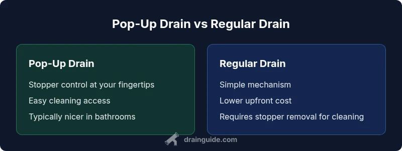 Pop-up drains are generally the better all-around choice for bathrooms, thanks to easier maintenance and stopper control; regular drains often win on upfront simplicity and cost in kitchens.