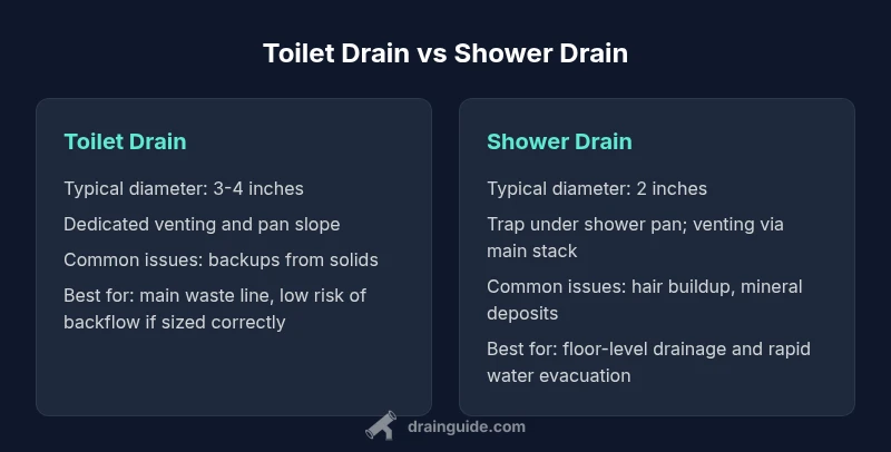 Understanding the distinction between toilet drains and shower drains is not a luxury; it’s a practical necessity that affects layout decisions, future maintenance, and the risk of backups. A mis-sized or poorly vented drain can turn a simple clog into a bathroom-wide nuisance. According to Drain Guide, recognizing how each drain handles waste, water, and venting helps homeowners plan a bathroom that drains efficiently and stays odor-free. In this block we cover the core reasons why these two drain types matter, what most homeowners confuse, and how to approach a remodel with both fixtures in mind. You’ll learn how a toilet’s large waste line differs from a shower’s smaller, more water-focused drain, and why those differences drive everything from pipe routing to trap placement and vent proximity. The goal is to equip you with a practical mental model you can apply whether you’re renovating a master bath, fixing a slow shower, or upgrading an old toilet.