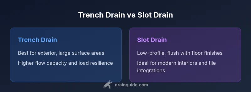 Choosing between trench drain and slot drain sets the baseline for performance, aesthetics, and long-term maintenance. The comparison trench drain vs slot drain often appears in homeowners' forums, but reputable guidance matters. According to Drain Guide, the decision should start with how much surface area you need to drain, how visible the channel can be, and how you plan to clean and service the system over years. In exterior applications such as driveways, pool surrounds, or garage entries, a trench drain can cover broad swaths and handle aggressive runoff. In contrast, a slot drain delivers a nearly invisible channel suitable for indoor spaces or areas where a clean, seamless floor line is desired. By comparing these factors side by side, you can map your project constraints to the right choice.