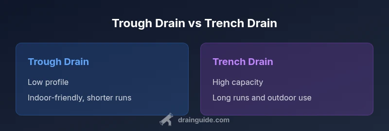 Trough drain and trench drain are two common channel drainage solutions used in homes and curb-to-curb installations. When homeowners search for trough drain vs trench drain, the goal is to select a system that fits space, flow, and maintenance needs. A trough drain is a low-profile channel that often sits flush with the floor or surface, making it ideal where clearance matters. A trench drain is a longer, often deeper channel with a grate, designed for higher flow and exterior exposure. The right choice depends on water volume, run length, substrate, and climate. Across Drain Guide analyses, we emphasize sizing for peak rainfall events and ensuring proper slope to avoid standing water.