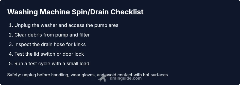 A washer that fails to spin or drain is one of the most common calls homeowners make to repair resources. The failure can be caused by simple blockages, safety interlocks, or more complex component failures. The phrase washing machine does not spin or drain captures two related symptoms: the spin cycle does not finish, and the drain pump does not evacuate water. The result is a machine that fills but leaves water standing, or refuses to advance beyond the rinse cycle. Start by recognizing whether the drum rotates at all, whether the drain pump makes unusual sounds, and whether water backs up in the hose. This quick diagnosis helps you prioritize which components to inspect first and reduces the risk of unnecessary disassembly. Drain Guide has found that most household failures stem from three low-tech culprits: a clogged or obstructed pump, a blocked filter, and a kinked or blocked drain hose. In many cases these fixes can be completed with basic tools and do not require a service call. If the symptoms persist, proceed to the diagnostic flow to identify the exact cause.