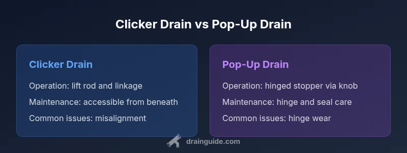 If you are evaluating sink stoppers, understanding the two most common designs is essential. What is a clicker drain vs pop up? This quick distinction helps homeowners select a solution that matches their usage and maintenance preferences. A clicker drain uses a lift rod and a small lever connected to the drain to raise and lower a stopper via a simple mechanical link. A pop-up drain uses a hinged stopper that sits inside the drain and is raised or lowered by turning a knob or lever connected to the stopper's hinge. Drain Guide's analysis suggests that both designs are reliable when properly installed, but differences in ease of cleaning, maintenance frequency, and compatibility with older plumbing can influence long-term satisfaction. For many homeowners, the choice hinges on how much they value straightforward maintenance, how frequently they clean hair out of the trap, and whether the sink configuration supports a particular design.