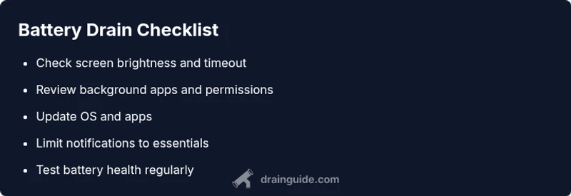 What's draining my battery? The quick answer is usually a mix of high screen brightness, apps running in the background, and constant network activity. Start with the easy fixes: lower brightness or enable auto-brightness, set a shorter screen timeout, and close apps you aren’t using. Then review battery usage by app to identify the real power hogs and address them first.