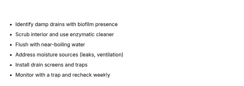 - Identify damp, biofilm-rich drains as the root cause.