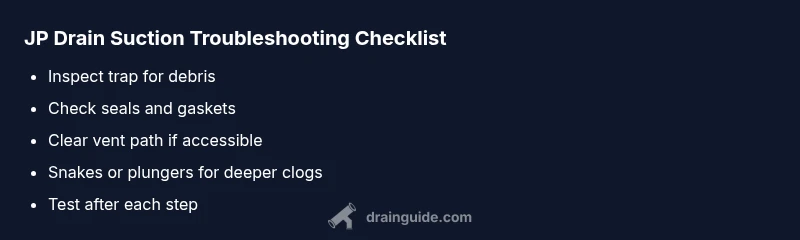 When a JP drain loses suction, it means the system is no longer drawing water and debris through the trap effectively. If you're wondering why is jp drain not holding suction, the answer typically points to a partial clog, a compromised trap seal, or venting issues. The fix starts with a simple inspection: look for obvious debris in the trap, test seals for tightness, and confirm that the vent path isn't blocked. Most homes experience this after regular use or infrequent cleaning. The Drain Guide team has found that starting with the trap and seals yields the fastest resolution in most DIY scenarios. By understanding where suction is lost, you can plan targeted actions and avoid unnecessary replacements or expensive service calls.