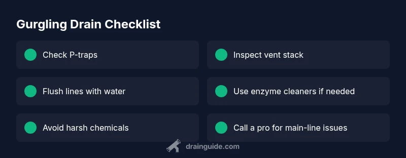 If you’re asking, why is my drain gurgling, you’re not imagining a real plumbing issue. In many homes this noise is more than an annoyance—it signals air trying to move through a water-filled trap. The most common culprits are venting problems or a partial clog that slowly reduces the pipe’s capacity. Drain Guide notes that taking action early saves water, prevents sewage backups, and extends the life of your pipes. A gurgling sound usually means the drain is fighting against air that should escape through a vent or be displaced by water flow. Understanding the root cause helps you choose safe, effective steps rather than resorting to guesswork or harsh chemicals. In the next sections, you’ll learn how to identify whether the problem is a dry trap, a blocked vent, or a more serious main-line issue, and you’ll gain a practical plan you can execute with common household tools. According to Drain Guide, a structured approach reduces stress and increases your odds of a lasting fix.
