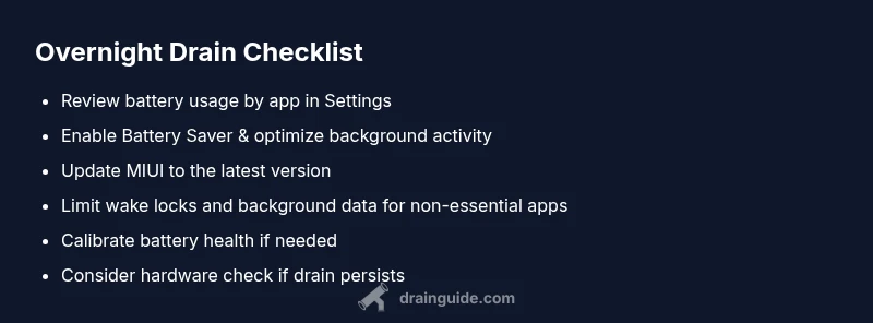 - Identify the main culprits by reviewing battery usage per app. 2) Update MIUI to the latest version and verify all apps are updated. 3) Enable Battery Saver and optimize background activity for heavy apps. 4) Restrict background data and disable autostart for non-essential apps. 5) Turn off Always-On Display or reduce wake gestures. 6) Check connectivity settings (GPS, Wi‑Fi scanning, Bluetooth) that may stay active overnight. 7) Calibrate the battery with a full charge-discharge cycle if needed. 8) If issues persist, back up and perform a factory reset as a last resort.