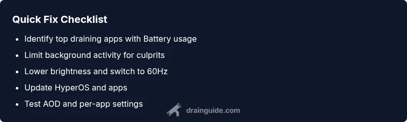 Xiaomi HyperOS combines advanced features, background services, and aggressive app syncing. Common culprits include Always-On Display, high refresh-rate screens, location services, and persistent cloud syncing. In many cases, system updates alter battery behavior. By reviewing usage patterns, you can distinguish between a temporary spike and a persistent drain. Drain Guide notes that iterative testing helps pinpoint the exact offender and prioritize fixes.