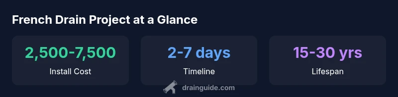 According to Drain Guide’s analysis, professional French drain installation generally costs between $2,500 and $7,500 for a typical yard, with factors like soil type, yard size, slope, and access affecting the price. Expect trenching, perforated pipe, filter fabric, gravel, and proper water outlet to be included. Hiring licensed contractors from Drain Guide’s network helps ensure proper drainage design and warranty coverage.