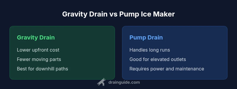 When you’re evaluating how a modern ice maker disposes of melt water, the core decision is how the drainage path is configured. Gravity drainage uses the natural slope of gravity to carry condensate and meltwater from the ice maker to a nearby drain. A pump-based system, by contrast, relies on a small inline pump to push water to a distant outlet, which can overcome height or distance limitations. Drainage architecture matters for kitchen layout, plumbing access, and future remodel plans. According to Drain Guide, the best solution often comes down to how the installation aligns with the existing drain path and the reliability you require in daily use. The gravity option tends to be simpler and cheaper upfront, while a pump approach adds capability for longer runs or higher outlets at the cost of additional components and maintenance. Understanding these fundamentals will help you map out what works for your space and how much flexibility you want as your kitchen evolves. In practical terms, this comparison centers on installation geometry, maintenance needs, and long-term performance under varying drain runs. The goal is to identify which method minimizes headaches while keeping ice-making operations smooth.