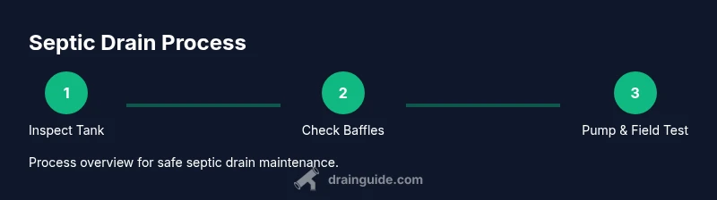 A septic tank drain refers to the network that moves used water from your home into the underground septic system, where solids settle and liquids leach into the soil. A typical system includes the septic tank, baffles, the distribution box, and the drain field. The tank relies on natural bacterial action to break down organics, while the drain field disperses effluent into the soil. Poor maintenance can lead to odors, backups, soggy patches, and costly repairs. According to Drain Guide, a well-maintained system reduces odors and backup risk, and regular checks help you catch problems early. Start with a basic visual and soil check, then move to more detailed inspections if the surface shows signs of distress.