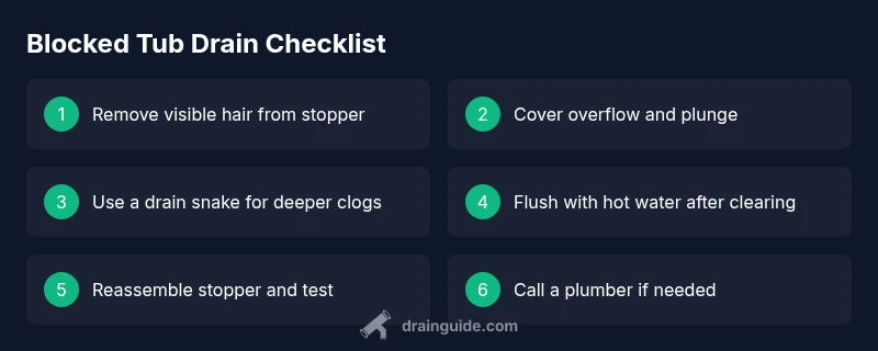 Hair and soap scum are the most common culprits behind a blocked tub drain. Start by removing hair from the stopper, then try a plunger or drain snake to loosen the clog. If water remains slow, flush with hot water and repeat. Avoid harsh chemical cleaners; if this doesn't work, contact a plumber.