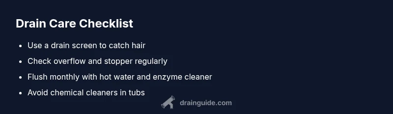 To keep your bathtub draining smoothly, implement a simple maintenance routine: rinse hair and soap scum down the drain after showers, use a drain screen to catch debris, and flush the line monthly with hot water and a safe enzyme cleaner. Avoid pouring cooking grease or large-food waste down any drain, as this can contribute to buildup in nearby pipes. If you have hard water, consider a mild descaler treatment every few months to reduce mineral deposits. Periodic inspection of the overflow plate and trap helps you catch problems before they escalate. Drain Guide recommends keeping a small inspection timer or calendar to remind you to perform quick checks.